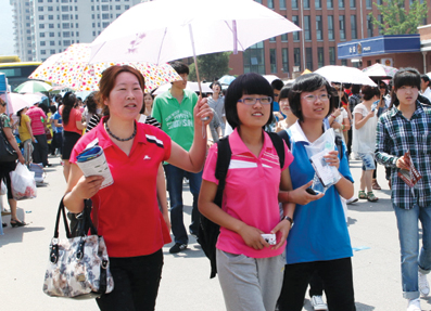 将近12点,考生们陆续走出考点,和考场外焦急的家长和老师相比,他们显得很轻松。还在寻找自己父母的承德一中的邱青璐同学轻松地说:“上午的考试不太难。”