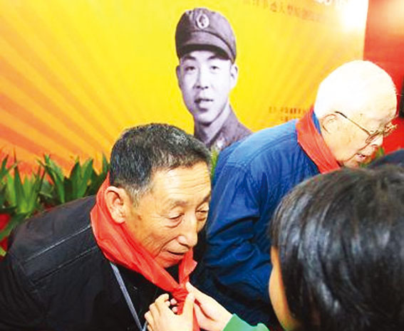 三月二日,《不朽的丰碑 永远的榜样——雷锋事迹大型原创摄影作品展》在北京军事博物馆开幕。影展共展出照片近三百张,以雷锋生前战友、为雷锋拍摄照片最多的摄影家张峻、季增的原创作品为主,同时收入了其他作者的部分作品,既有全国人民熟知的老照片,更有第一次公开的珍贵历史照片。图为在开幕式上少先队员为我市老摄影家、原《承德日报》主任记者季增(左)佩戴红领巾。查春明 摄