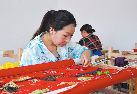 为了让满族非遗艺术重放光彩,我市通过寻找民间艺人、培训传承人等多种途径拯救濒临失传的满族绝艺。目前,我市已初步形成了14大类147项的国家、省、市三级非遗保护名录体系,丰富多彩的民族民间文化艺术重现昔日璀璨之光。图为学员正在围场绣工培训班上学习满绣。记者 李国强 摄