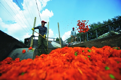 近年来,围场满族蒙古族自治县为了增加群众脱贫路径,引导农户发展万寿菊种植产业,对万寿菊规模种植户给予每亩600元补贴。目前,该县万寿菊种植面积近8000亩,种植户亩均可收入4000元左右。图为围场西龙头乡一种植户正在装运万寿菊。本网记者王立群摄