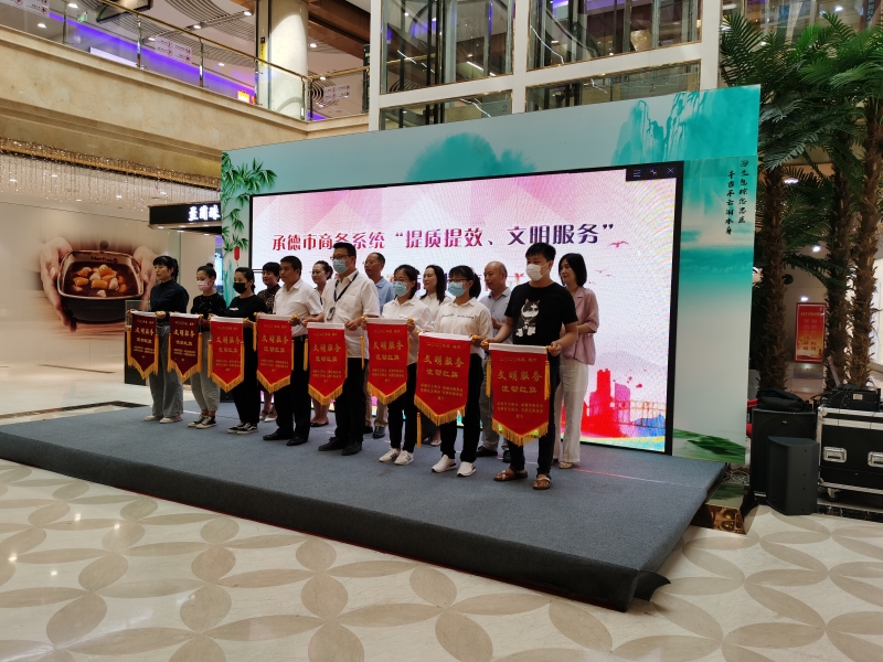 8月 21日上午,承德市商务系统“提质提效 文明服务”创建竞赛活动授旗仪式在承德金龙购物广场一楼大厅圆满举行。市委宣传部、市文明办、市商务局主要、分管负责同志,双桥区、双滦区文明办、商务部门负责同志,承德金龙购物广场、双百购物广场、宽广超市集团有限公司等12家企业主要负责人参加了授旗仪式。