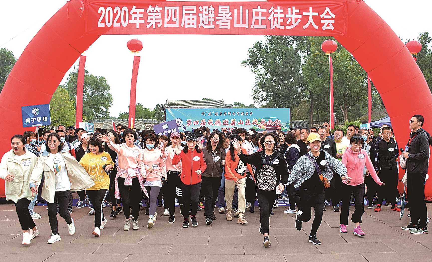 本网讯(记者 李国强 通讯员 秦晶晶)9月25日上午,第四届承德避暑山庄徒步大会在德汇门广场启动,来自34支代表队的400名徒步爱好者在欣赏金秋美景的同时沿武烈河岸完成了9公里的徒步之旅。此次活动旨在展现避暑山庄及周边景区的历史风貌和现代韵味,倡导广大居民绿色出行、走向户外、走向健康。图为徒步爱好者在德汇门广场整装出发。