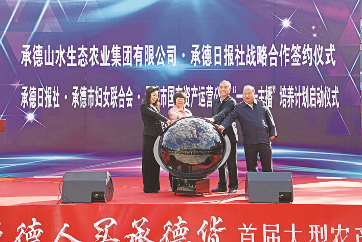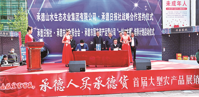 10月1日,在大鼓舞激昂的节奏中,“承德人买承德货”首届承德农产品展销活动正式拉开帷幕。开幕仪式上,承德日报社与承德山水生态农业集团有限公司签订了战略合作协议,同时与承德市妇女联合会、承德市国有资产运营公司联合启动了“一村一主播”培养计划。