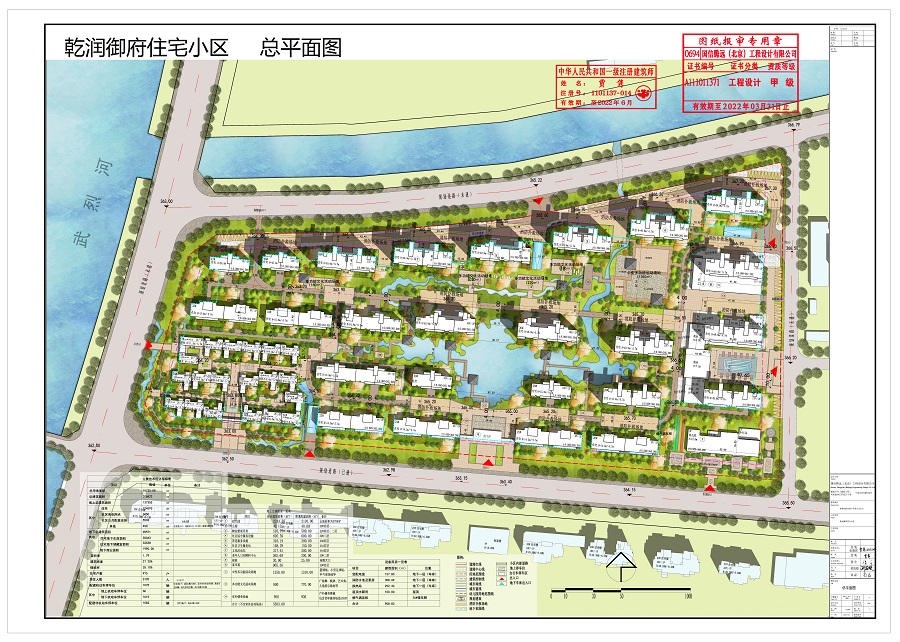 乾润御府住宅小区项目用地位于双桥区双峰寺镇空港城A2地块,东至承德市双桥区人民法院审判法庭用地,西至武烈河,南至恒大悦府项目及现状道路,北至双峰寺镇小东沟村用地,规划用地性质为居住用地,规划建筑用地面积76735平方米,规划总建筑面积206822平方米,其中地上建筑面积137355平方米,地下建筑面积69571平方米,容积率1.79,建筑密度27.20%,绿地率35.10%,停车位1075个。详细内容见公示总平面图、效果图。