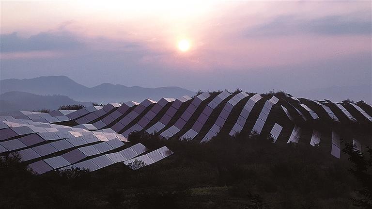 本网讯(记者 李国强 通讯员 徐莹莹 摄)近年来,我市立足京津冀水源涵养功能区定位,加快山地光伏发电项目建设,实现土地生金富民。图为总投资11.2亿元、占荒坡约4500亩、年平均发电量14500万千瓦时的中国北方山地占地面积最大光伏发电项目——承德县三沟镇100兆瓦光伏发电项目。