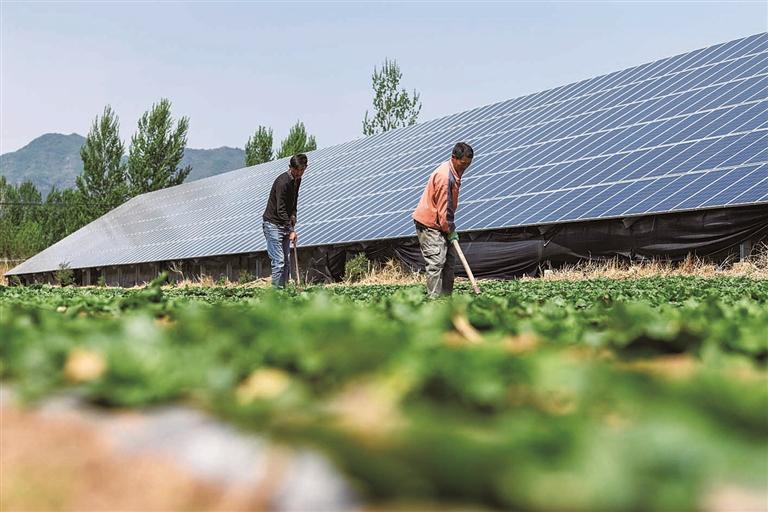 我市将光伏发电和高效农业有机结合,因地制宜打造“农光互补”光伏项目,建设一体化现代农业光伏产业园区,促进农民增收,助力乡村振兴。图为承德县石灰窑镇一处现代农业光伏产业园内工人正在菜地劳作。