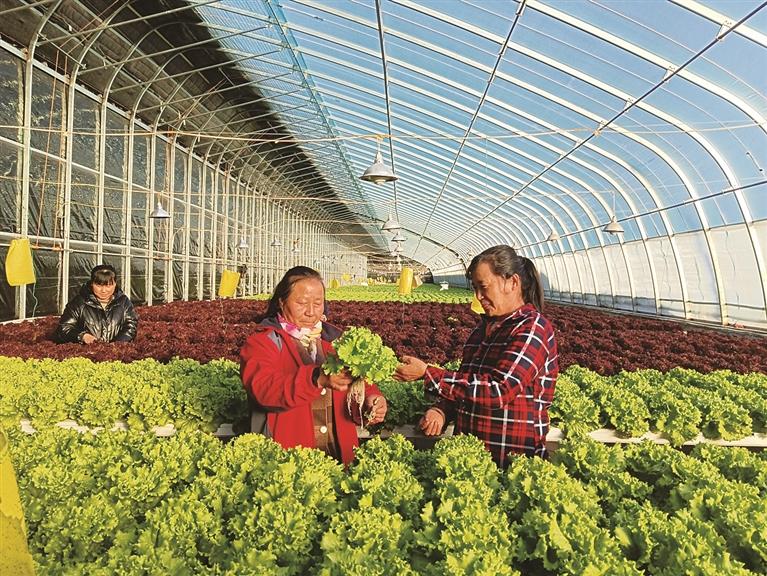 丰宁依托物联网、大数据、云计算等信息技术,打造数字化无土栽培蔬菜种植模式,蔬菜种植面积15.8万亩,其中数字化无土栽培蔬菜2.2万亩,年产值达2.6亿元,带动了5000余户村民增收致富。图为该县胡麻营镇村民在数字化无土栽培蔬菜种植大棚进行日常管护。