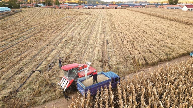 金秋时节,平泉市黄土梁子村的千亩旱稻迎来丰收,稻田里一片金黄。图为稻农们抢抓农时开镰收割。