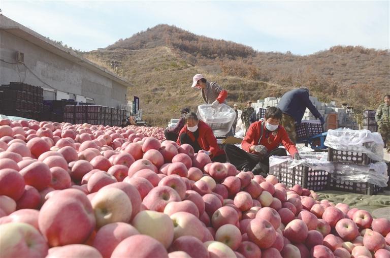 近日,走进宽城满族自治县化皮溜子镇西岔沟村的果园内,红彤彤的苹果缀满枝头,弥漫着沁人的果香,果农们忙着摘果、分拣、装运。近年来,宽城积极引进科研院所技术支持,着力打造品牌。目前,全县苹果栽植面积14.38万亩,年产苹果约2.6万吨,在林果产业带动下,农民收入持续稳定提高。图为果农们正在分拣苹果。