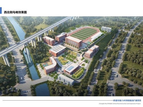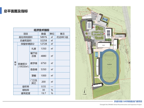 承德市第八中学位于双桥区大石庙镇,用地面积58975.55平方米。因学校部分建筑、设备管线等严重老化,存在安全隐患,而且教学用房及宿舍等使用面积不足,严重不达标。现拟进行改扩建:规划保留并加固现状艺术楼、综合楼和六层学生公寓楼;拆除教学楼、餐厅、四层学生宿舍楼和教工宿舍,拆除总建筑面积8972平方米;新建礼堂、餐厅综合楼、教学楼、宿舍楼、体育场看台等,新建总建筑面积19530平方米。详细内容见公示图纸。