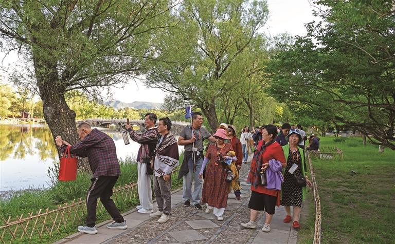 随着旅游旺季的到来,我市旅游市场持续升温,避暑山庄及周围寺庙景区更是以其独特的风采吸引了众多外地游客前来避暑游玩。图为游客在避暑山庄景区内游览。