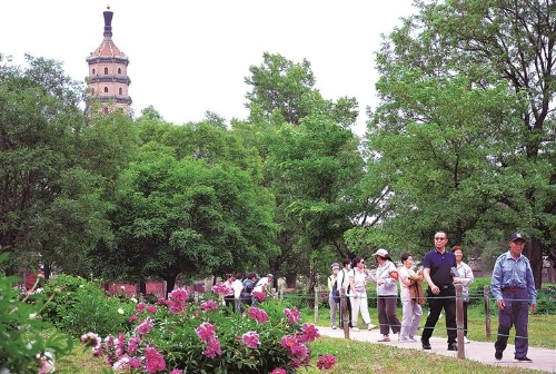 来承康养旅游的老年人在避暑山庄牡丹园游园赏花。 本网记者 李国强 摄