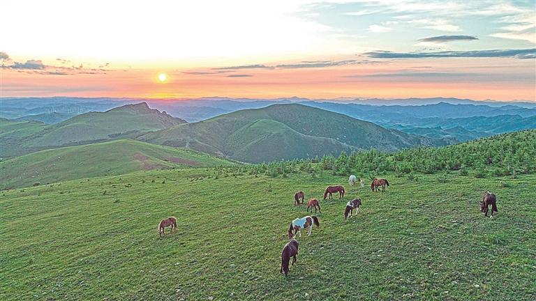 夏日,丰宁满族自治县坝上地区水草丰茂、景美如画,凉爽宜人的气候吸引各地游客前来畅享夏日清凉,感受秀美风光。图为丰宁坝上云中草原日出景色。