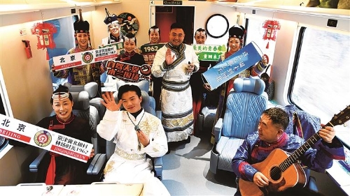 车窗外,冬日的华北平原银装素裹,雪覆田畴与墨绿林带交织成如画景致;车厢内,围场的小伙子们手捧马头琴奏响悠扬旋律,姑娘们身着艳丽的满族、蒙古族服饰,随着节奏跳起轻快的安代舞,清亮的歌声与欢快的舞步交织,将承德人的热情与豪迈洒满整个车厢……一场别开生面的“移动式+沉浸式”冰雪温泉旅游季启动仪式,就此在京津冀的铁道线上拉开帷幕。