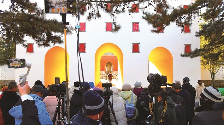 日前,普陀宗乘之庙(小布达拉宫)呈现“金光穿洞”奇景,阳光照进五塔门,光影交织成绝美画卷,吸引大量游客、摄影爱好者专程到访打卡。图为游客正在拍照。