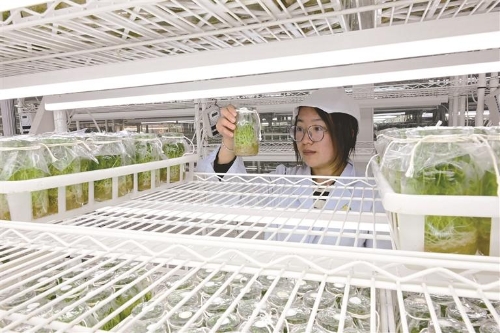 近年来,围场借助大数据、物联网等新技术,助力马铃薯产业呈现出科学化、精准化、智慧化的现代农业发展态势,并积极发挥马铃薯研究院科研优势,进一步实现产学研一体化,加快科技成果产业化,全力做好马铃薯新技术、新品种的推广工作。图为承德大丰马铃薯种业有限公司工作人员正在智能繁育网棚里查看脱毒薯苗。