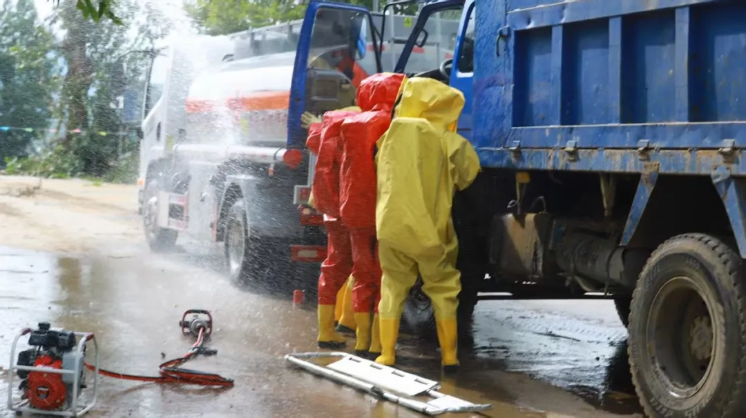 本次演练模拟背景为,当天9时50分,丰宁满族自治县内省道S244半虎线,天桥镇南大道时,因前方桥梁施工,一辆载有约30吨二甲苯的危化品罐车紧急制动,后方一货车避让不及发生碰撞,导致大量二甲苯及柴油泄漏,有毒有害气体威胁到事发点下风向沿线群众安全,部分泄漏污染物进入潮河威胁下游沿线水质安全,情况危急。