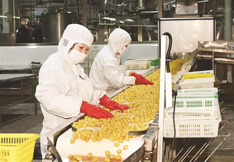 近年来,我市加快农产品深加工产业发展,赋予农产品更多生态附加值,目前在多个县(市、区)建成以龙头企业为引领、现代化产业基地为带动、种植户为支撑的多种农产品产业链条,有效带动乡村产业振兴。图为承德神栗食品股份有限公司板栗深加工生产线一角。 本网记者 李国强 摄