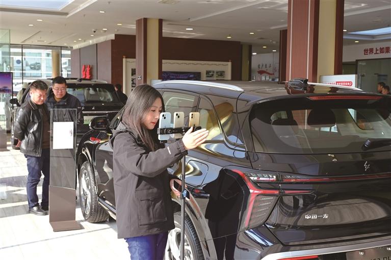 随着春节假期结束,我市消费市场迅速回暖。图为双滦区汽车小镇的一家新能源汽车销售门店内,销售员以直播的方式详细讲解2026年最新的汽车以旧换新补贴政策。