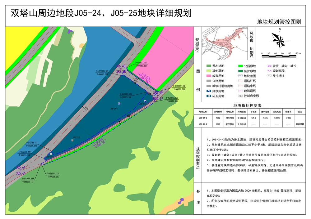3、拟规划确定各类用地规模为:排水用地(J05-24-2地块) 0.53 公顷,环卫用地 (J05-25-2地块) 0.26 公顷,道路用地 0.89 公顷,公园绿地 0.31 公顷。