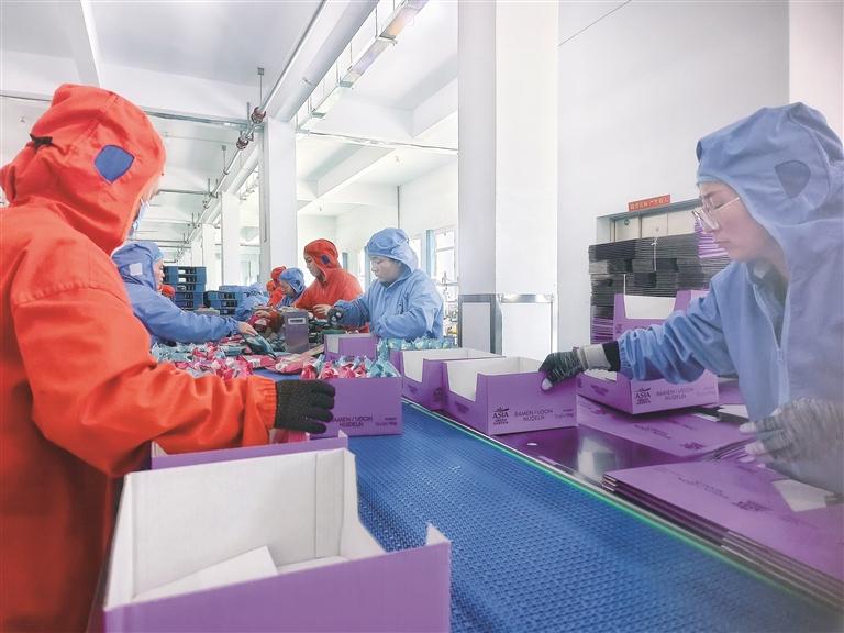近年来,我市持续优化产业结构,推动园区经济扩容提质,带动群众就地就近就业。目前,丰宁大阁镇经济开发区已形成“一心三园”格局,注册企业近400家,其中产业链重点企业161家,企业规模不断发展壮大,提供就业岗位1700余个。图为在河北金田麦国际食品有限公司半自动化生产线上,工人正忙碌地分装出口产品。