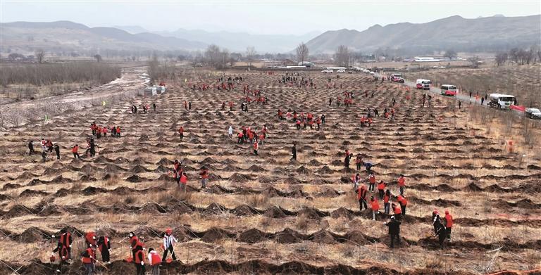 近日,丰宁满族自治县2026年义务植树活动在小坝子乡海子沟村举行。200余名志愿者齐聚现场,挥锹铲土、扶苗培土、提水浇灌,一派热火朝天的忙碌景象。经过大家的共同劳作,2700株杨树苗在35亩土地上整齐栽植,为春日大地披上盎然新绿。图为活动现场。 本网记者 张雨樵 通讯员 李建坤 摄
