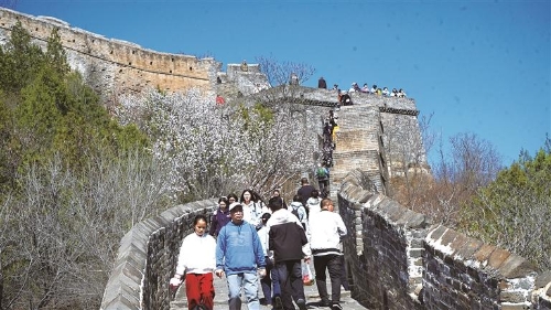 十万亩野生杏花漫山遍野,如云似霞,登上将军楼,极目远眺,皆是春日盛景。在车道沟楼东侧马道,粉白花海与雄健城墙刚柔并济,构成一幅动人心魄的天然画卷,游客们或驻足观赏、或合影留念,摄影师们举着相机不停按下快门,定格风景大片。“这也太好看了,我要把这张照片设成手机壁纸!”一位年轻姑娘举着相机,对眼前的美景连连惊叹。
